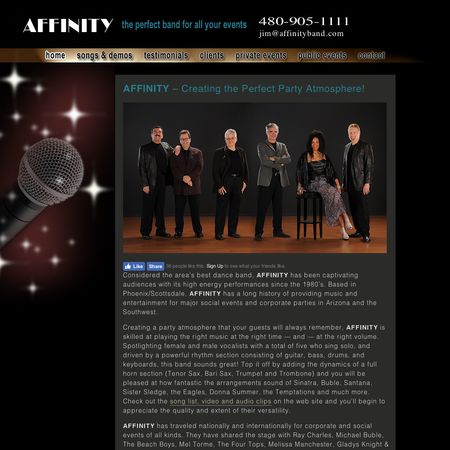 Whether you are looking for a small band for your intimate gathering or a large band for your event, AFFINITY is the perfect band for your budget or your venue. AFFINITY knows how to create the perfect party atmosphere for weddings, corporate events, banquets, themed parties, or any event that you want to turn out perfect. Once clients use AFFINITY, they come back again and again, even flying the band outside Arizona to destination events.