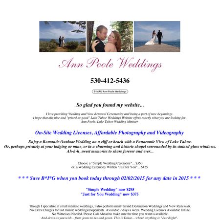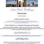 I love providing Wedding and Vow Renewal Ceremonies and being a part of new beginnings. Though I specialize in small Intimate Weddings and Vow Renewals, I also perform many Grand Destination Weddings. No Extra Charges for last minute weddings/elopements. -- Ann Poole, Lake Tahoe Wedding Minister.
