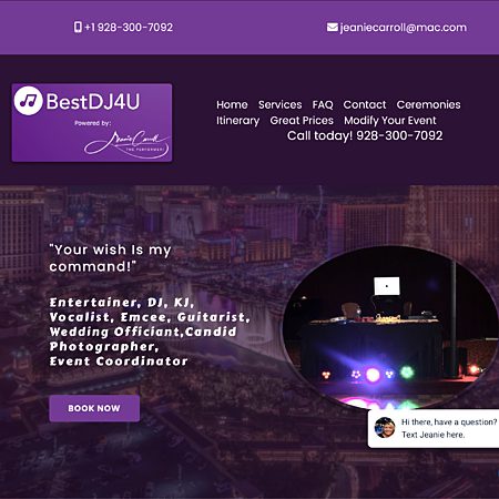 Your Professional DJ Jeanie Carroll for Weddings and Parties, Solo Vocalist & Guitarist, Duos, Trios, Combos, Big Bands, Corporate Events MC, Cabaret Performer, Karaoke Hostess, Candid Photographer, Day-Of Coordinator, and Wedding Officiant!