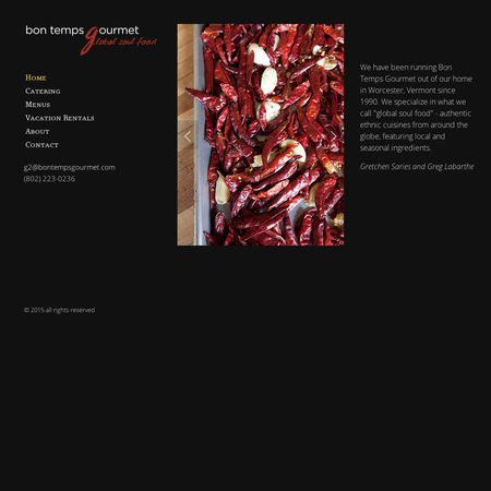 We have been running Bon Temps Gourmet out of our home in Worcester, Vermont since 1990. We specialize in what we call "global soul food" - authentic ethnic cuisines from around the globe, featuring local and seasonal ingredients.