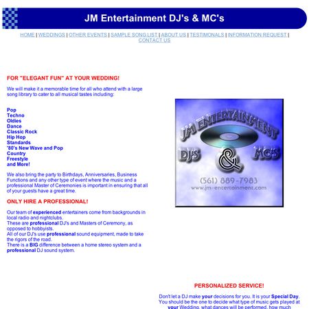 JM Entertainment is owned and operated by South Florida radio personality "Rock n' Roll Joel". We serve all areas, from Miami to Fort Pierce. With our professional service, you get to personalize your Wedding Reception to your liking. Our expertise in the field will guide you through the process and we handle all the details for you.