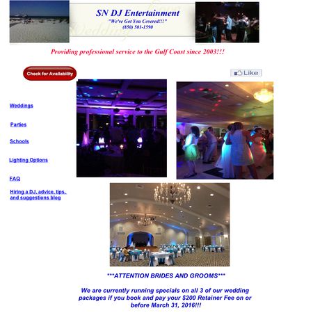 SN DJ Entertainment is a full time, professional, wedding DJ entertainment and reception planning business! We offer services in wedding receptions, ceremonies, decorative up-lighting as well as entertainment planning and directing. Unlike other DJ services we do not charge an "hourly" rate so you pay one flat rate and you can have your DJ for as long as you like on your wedding day with no overtime fees unless your reception goes past midnight! Contact us today for a free consultation!