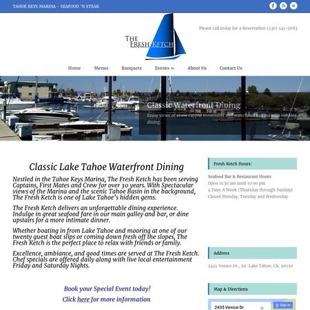 The Fresh Ketch’s location in the Tahoe Keys Marina, offers your group majestic views of Lake Tahoe and the Sierra Nevada Mountains. The Atrium, our glass-enclosed banquet room is the ideal setting for private parties, wedding receptions or conferences and is able to accommodate parties of up to 80 people. In combination with our main upstairs dining room, the Ketch can accommodate parties of up to 180.